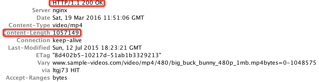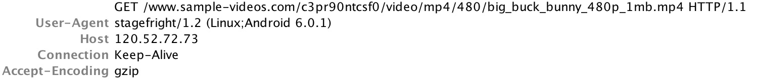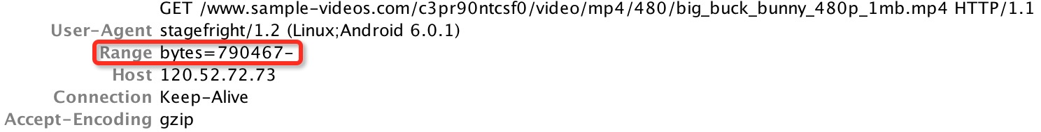 VideoView播放在线视频的时候,发出的GET请求。第一次是一个普通的请求,务器返回200;之后的则全是分段请求,服务器返回206。